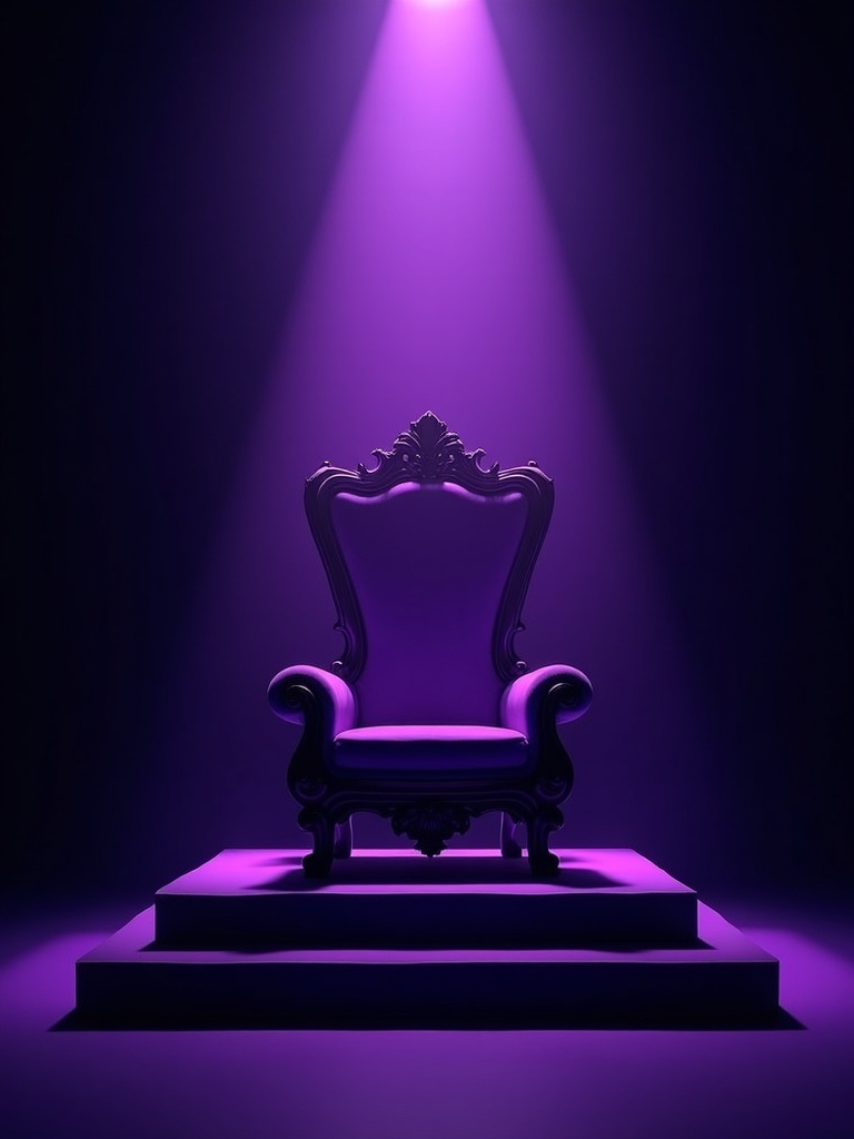 A ceremonial throne assembled from dense violet luminosity and lavender edges, with a dim plum shadow beneath it as if light itself has weight, black gallery setting, dramatic frontal composition, luxurious surrealism