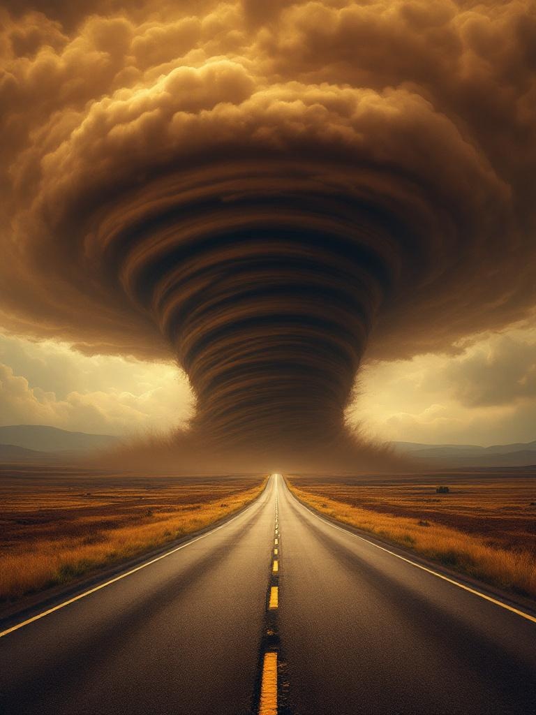 A dead-straight highway vanishing into a colossal layered brown tornado, ochre clouds, deep earth shadows, monumental storm realism
