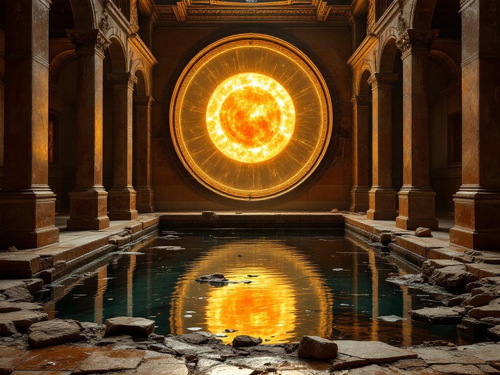 An abandoned Roman bath of polished brown marble, a huge sepia sun disk reflected in still water, broken arches and soft dust, luxury ruin realism