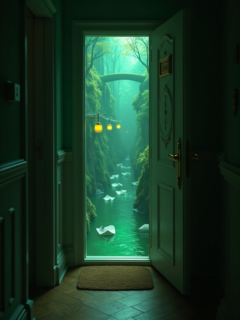 An apartment hallway door seen up close, the narrow brass mail slot opening into a luminous canal lined with mossy walls and tiny bridges, folded letters drifting through the water like paper boats under mint-green lamps, soft green glow spreading across the doormat and baseboards, a common domestic detail concealing an impossible inner world, highly detailed, realistic, cinematic