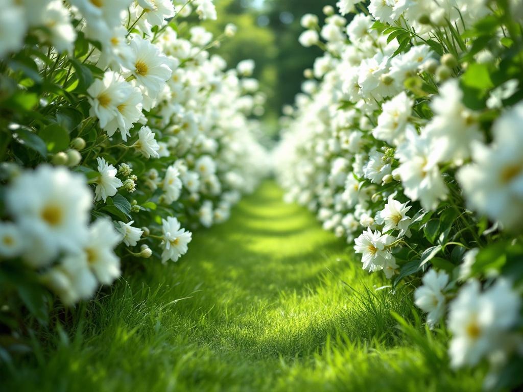 A narrow garden path enclosed by dense blooming white flowers on both sides, fresh green grass underfoot, bright natural daylight, immersive floral tunnel, romantic botanical photography