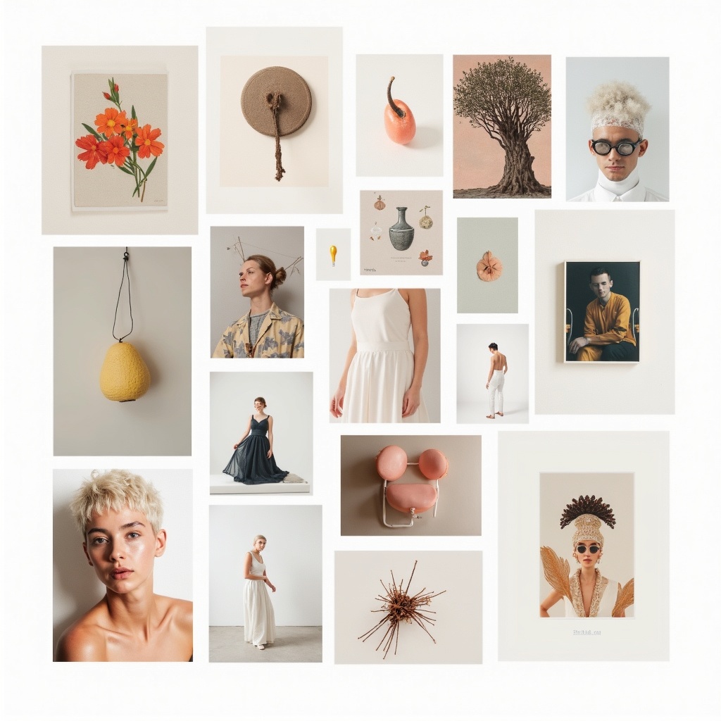 Curated visual moodboard arranged as a clean grid of surreal objects, portraits, painting fragments, product shots, and handcrafted illustrations, white interface background, eclectic art direction, premium inspiration board