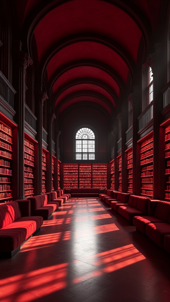 Grand monochrome library interior with soaring arches, endless shelves, velvet seating, polished floors, and warm crimson light washing across the space, symmetrical composition, luxurious atmosphere, refined architectural photography mood, deep wine-red shadows, rich material texture, no distracting people or clutter