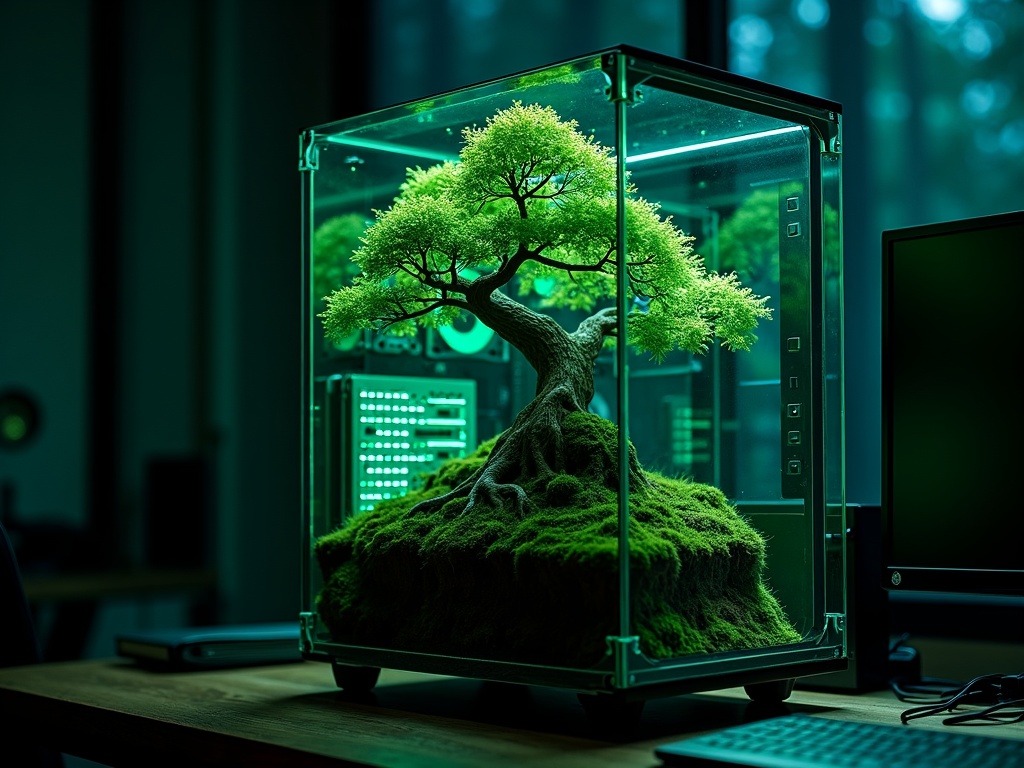 A transparent desktop computer tower on a late-night studio desk, inside it a living bonsai root system threads through glowing mint-green circuit boards, soft green status lights pulse like fireflies behind the glass panel, dense natural green moss gathers around the cooling fans, deep forest shadows fill the room beyond the monitor, impossible but believable product-meets-lab scene, richly layered, hyper-detailed, sharp focus