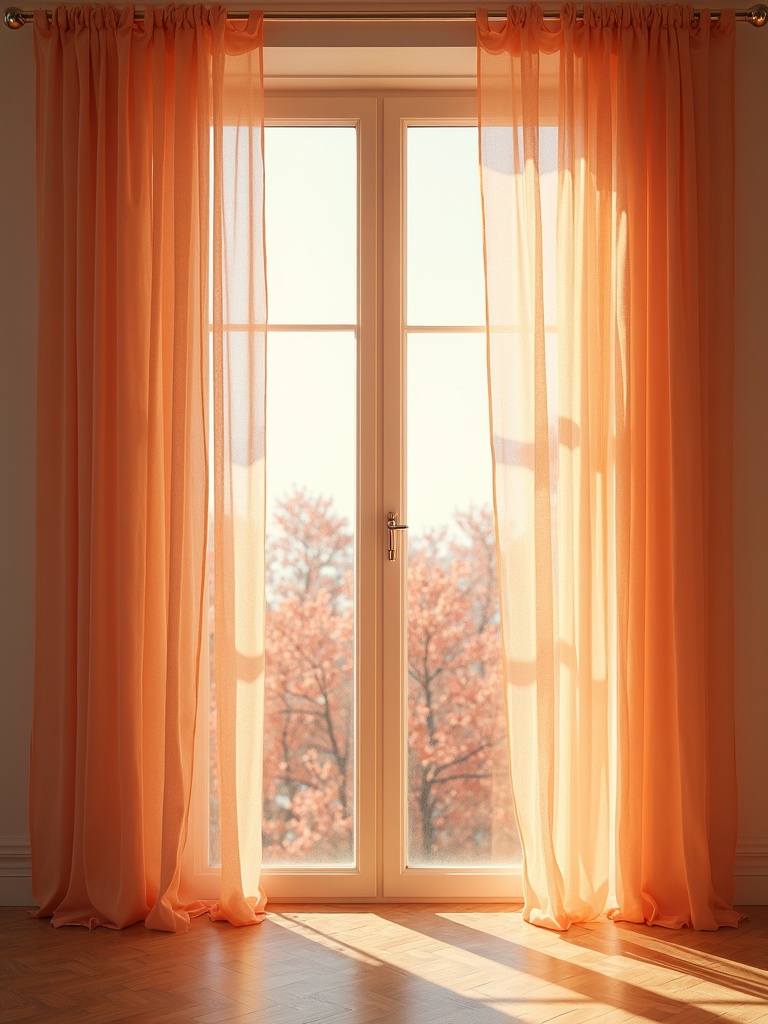 A tall apartment window filled edge to edge with suspended apricot crystal branches instead of glass, soft peach daylight scattering across the room, elegant surreal realism
