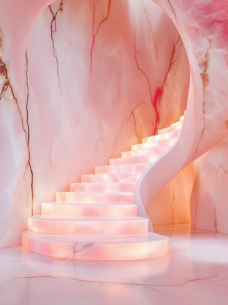 A sweeping staircase carved from translucent pink onyx, each step glowing softly from within, powder-pink walls, one vivid cheeky pink seam running through the stone, refined interior photography