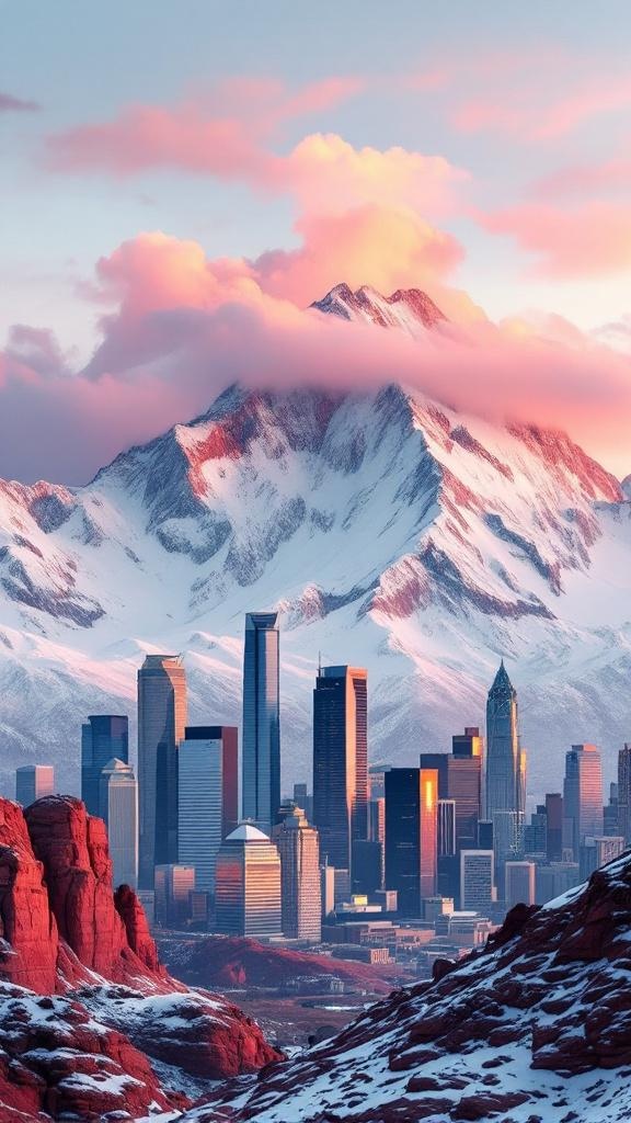 A modern city skyline at golden hour with massive snow covered mountain peaks rising directly behind the skyscrapers, red sandstone rock formations in the foreground, the last warm pink and peach sunlight hitting the snow and building windows, soft clouds glowing salmon and rose above the peaks, the layered depth from red rocks to glass towers to white mountains, landscape photography, 8k