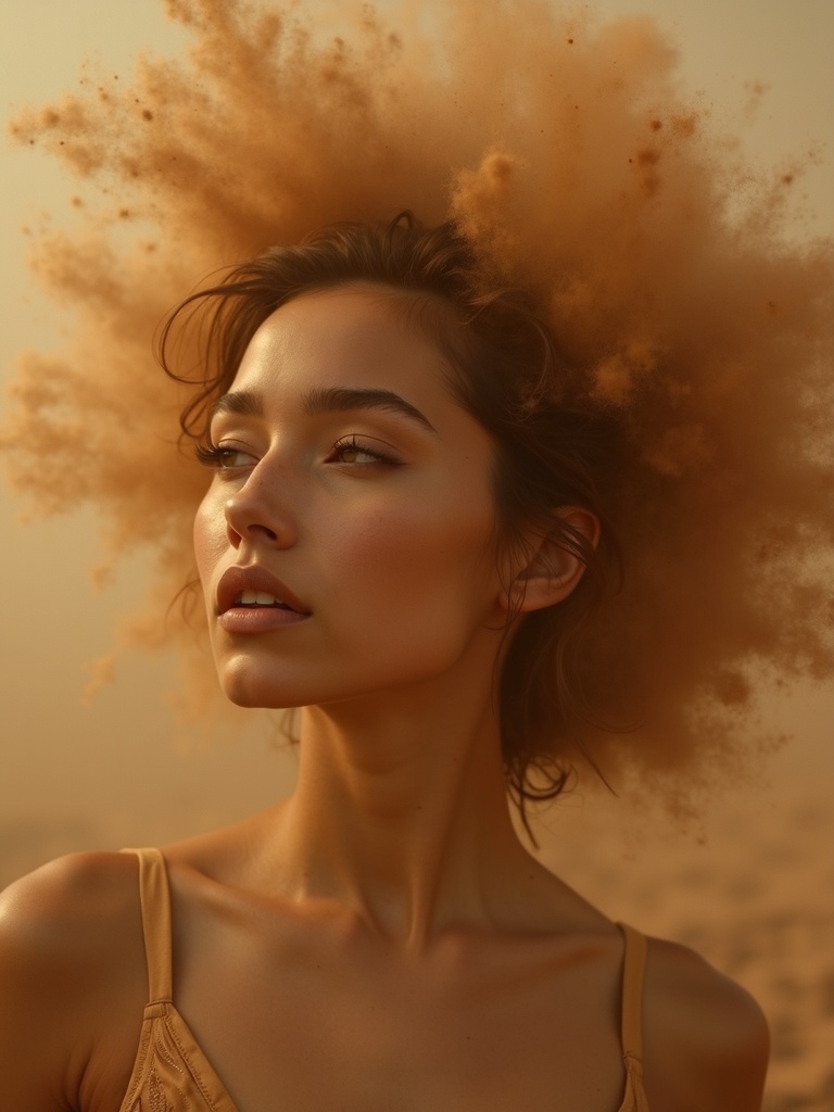 A strong female portrait with a halo of suspended brown dust exploding softly behind her head, warm sepia palette, high-end editorial hero shot