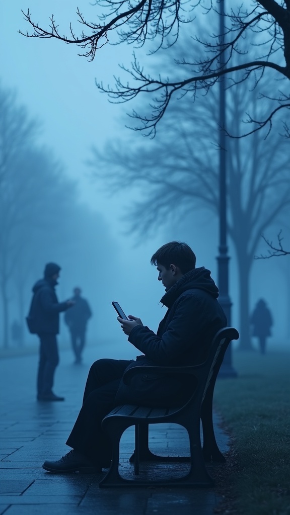 A lonely person with a phone in the style of Picasso blue period, sitting on a park bench staring at a screen, blurred figures of passersby around, elongated forms and cold blue tones creating a feeling of alienation, color palette of shades of blue grey and white, minimal details with emphasis on emotion, centered composition directing the viewers gaze toward the phone screen, 8k