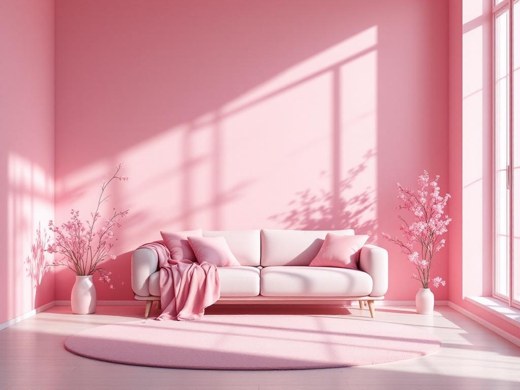 A minimalist apartment living room built around one emotion: tenderness, pastel light pink walls, classic pink rose haze gathered near the sofa, authentic pink daylight, soft contemporary surrealism