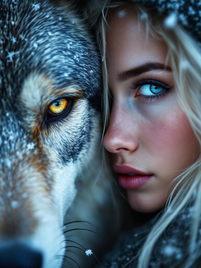 Extreme close up of a young womans face next to a grey wolfs face, both looking directly at the camera, snowflakes on the wolfs fur and in her silver blonde hair, icy blue and silver tones, the wolfs amber eye and her blue eye side by side, frost on her eyelashes, winter forest mood, intimate wildlife portrait, 8k