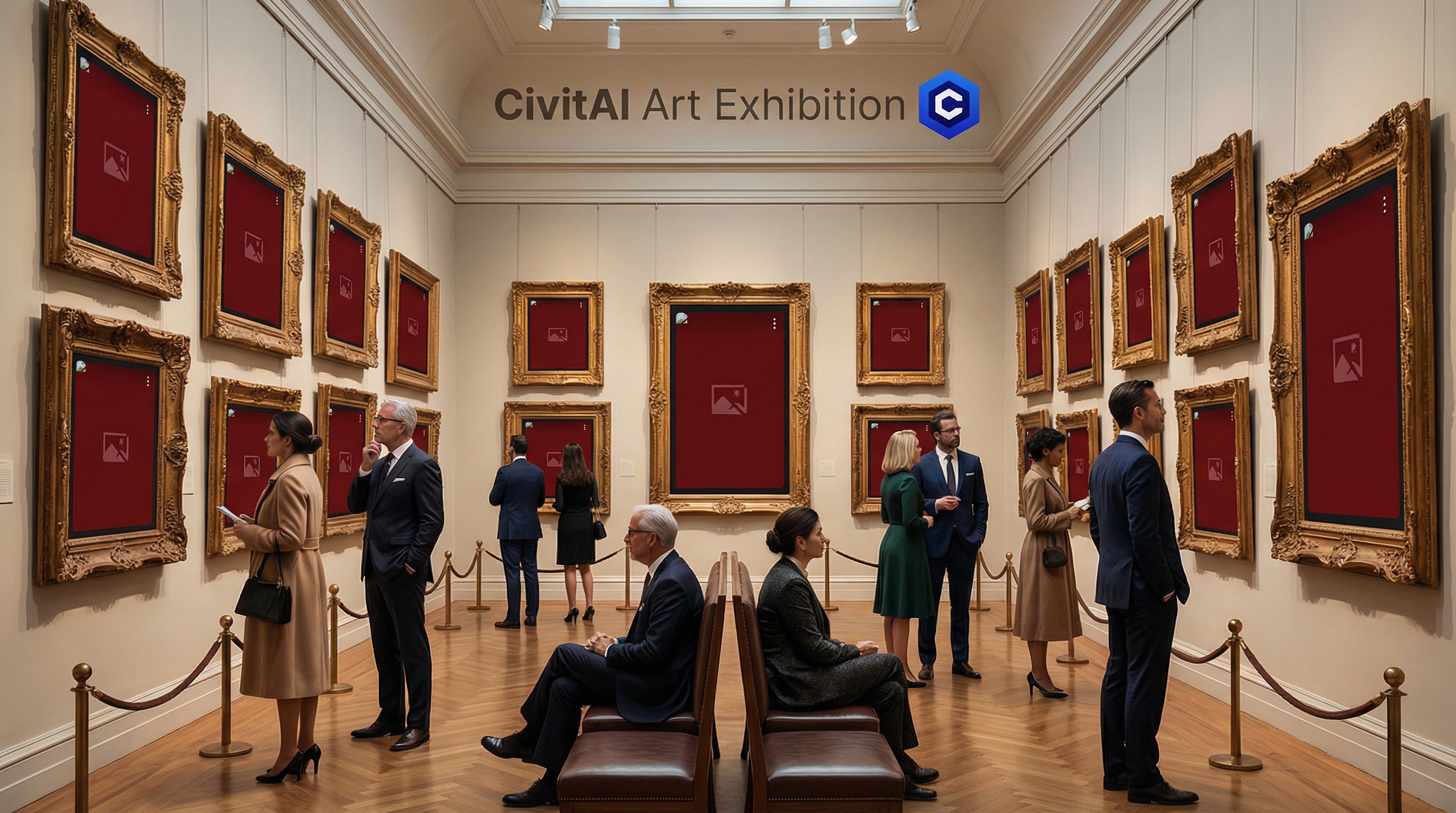Фотореалистичное ультра детализированное изображение. Картинная галерея, в которой утонченные ценители искусства с умным видом разглядывают экспонаты, но вместо всех картин в красивых резных рамках находится красное загруженное изображение. На стене под потолком написано название выставки CivitAI Art Exhibition с синей эмблемой со второго изображения.