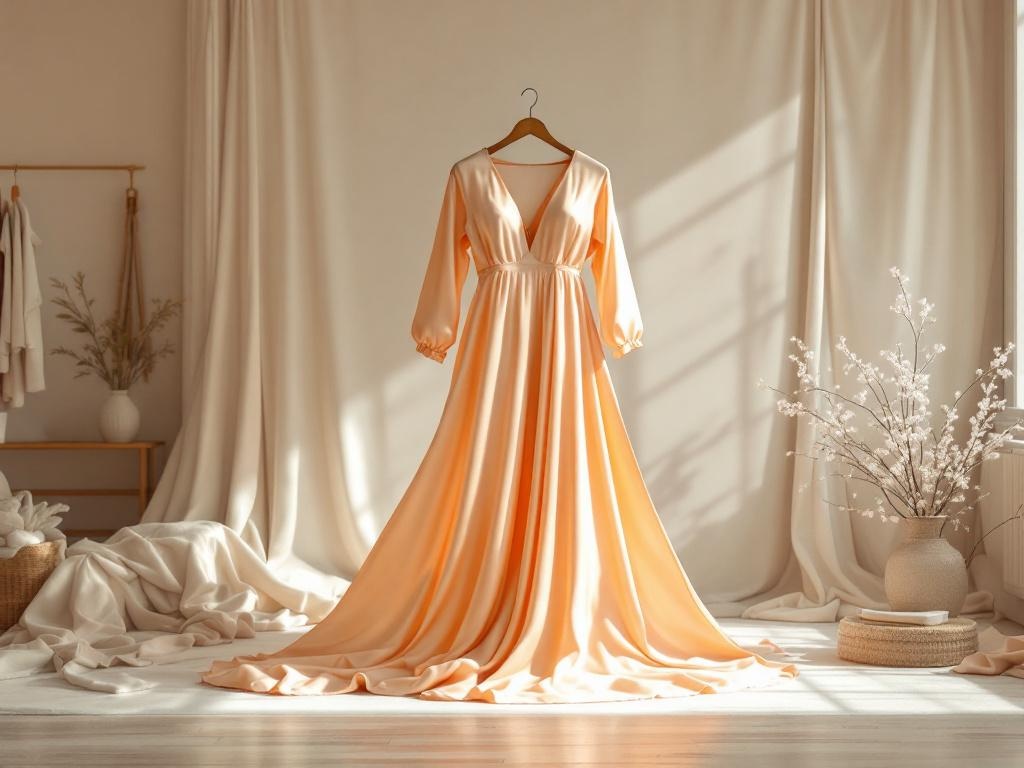 A tailor's studio where one silk dress is frozen midair as a hollow arch of soft peach fabric, natural orange lining, quiet luxury, clean daylight, highly detailed
