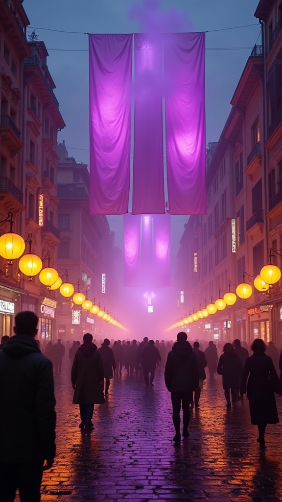 A wide city square during a surreal night festival, giant violet banners hanging between buildings, glowing yellow lantern installations floating above the crowd, purple smoke drifting across the cobblestones, bright yellow neon signs reflected in rain-soaked pavement, layered architecture, lively atmosphere, strong yellow and purple dominance, immersive environment, cinematic realism, ultra-detailed, sharp focus