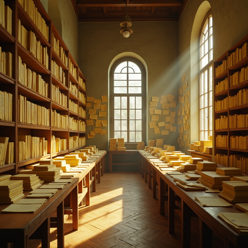An old archival reading room with towering shelves packed with pale yellow books, soft yellow folders, lemon-yellow paper rolls, and hundreds of pinned notes covering the walls, tall windows casting clean daylight across wooden tables, thin dust drifting through the air, layered interior depth, tactile paper textures, immersive environment, realistic, ultra-detailed, sharp focus