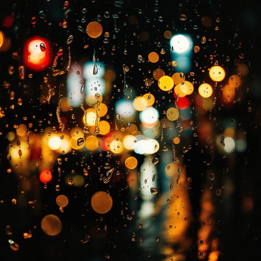 A nighttime city scene shot through rain covered glass, everything blurred into soft warm golden and amber bokeh circles, the lights of shops and streets dissolved into abstract glowing orbs, hints of dark silhouettes barely visible, the overall mood warm intimate and atmospheric, the palette deep warm gold against darkness, street photography, 8k