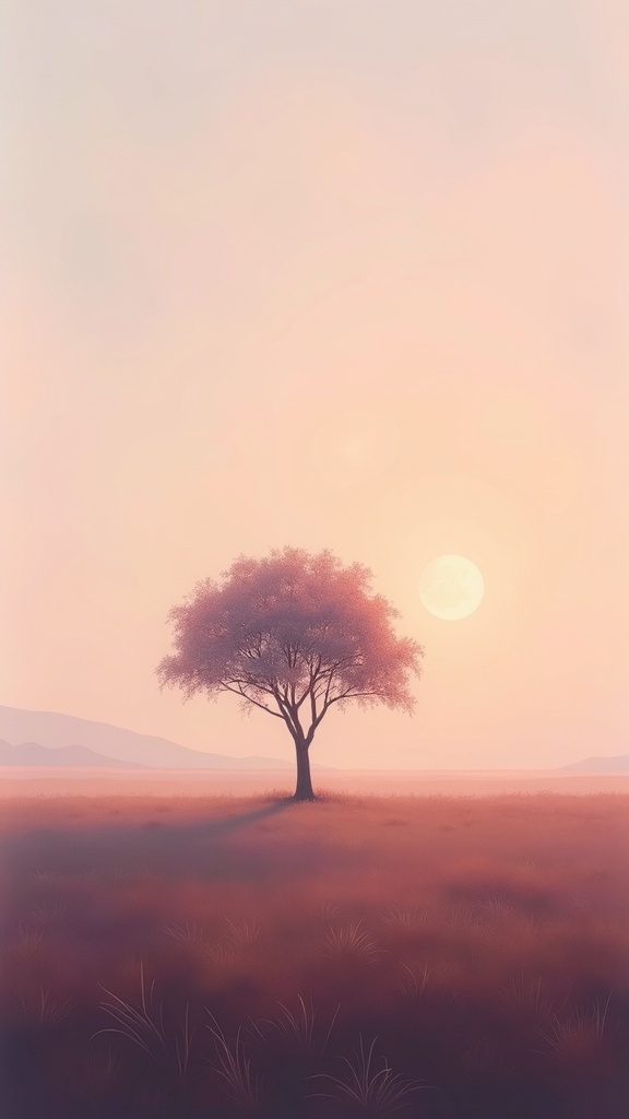 Atmospheric landscape painting of a lone tree in an open plain under a pale peach-and-lilac sunset sky, soft brushwork, meditative stillness, fine-art landscape mood