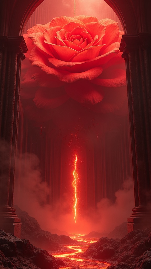 Ultra-cinematic surreal scene of a colossal cathedral blooming from the center of a giant red rose growing inside an active volcano, impossible scale, molten petals arching like gothic vaults, rivers of glowing crimson lava flowing through marble corridors, suspended incense smoke, dramatic top-down shafts of light, the entire image dominated by deep scarlet, crimson, ruby, and wine-red tones, luxury fantasy realism, highly detailed textures, grand composition, no competing colors, no text