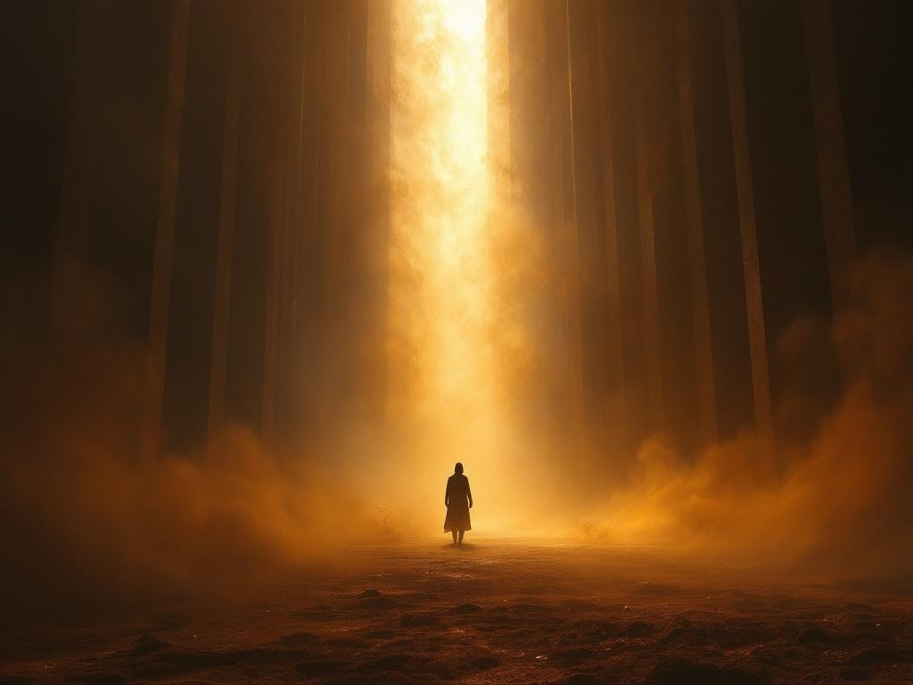 A vast interior hall filled with rolling brown smoke and drifting ember-colored dust, one lone figure in the center, dramatic light shaft