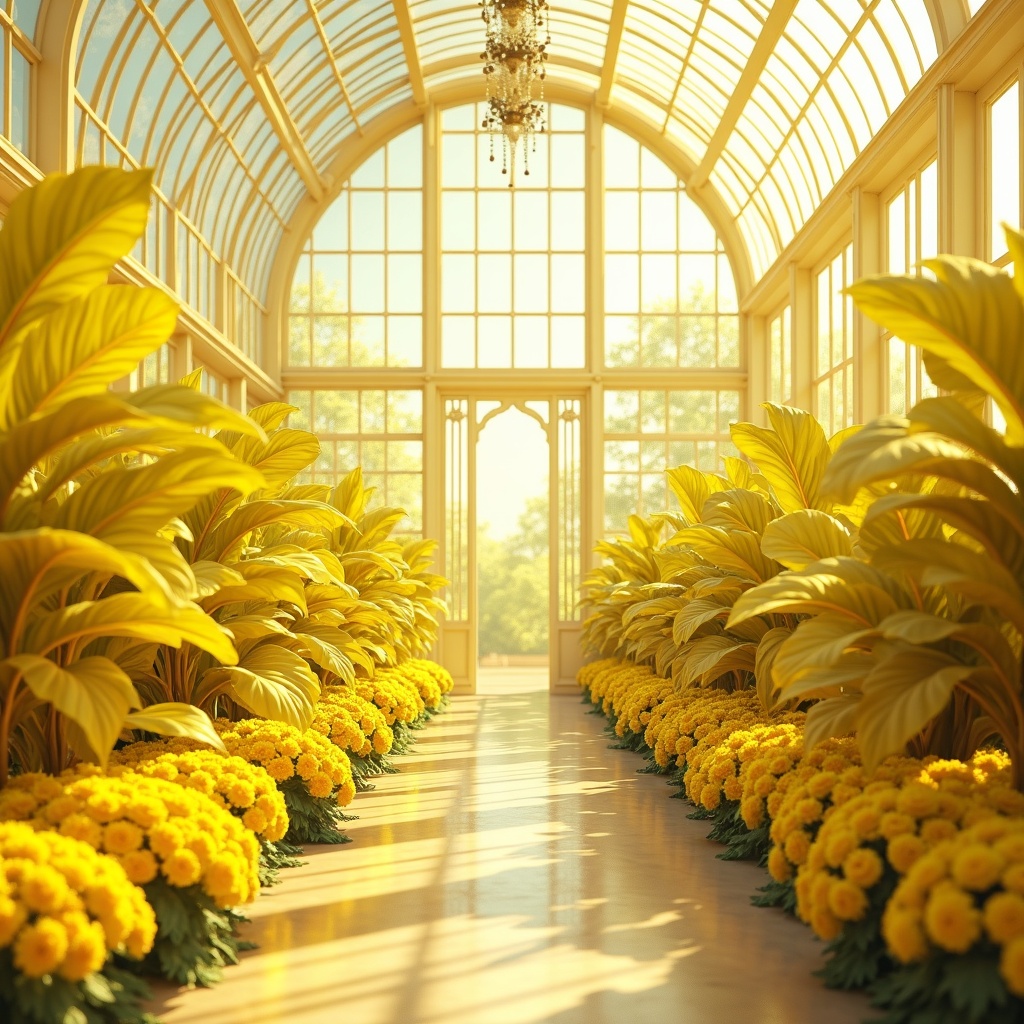 A grand greenhouse built from pale yellow and soft yellow glass panels, filled with layers of lemon yellow flowers and broad yellow leaves, clean reflections across the glass, bright diffused daylight, fresh botanical atmosphere, richly textured environment, realistic, highly detailed, sharp focus