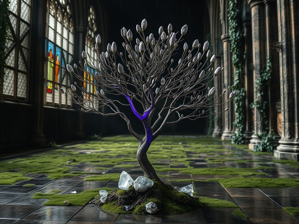 A young tree grown from clear crystal and amethyst mineral clusters, slender branches tipped with pale lavender buds, a quiet violet glow running through the trunk, dark gallery floor, surreal botanical realism, 8k, rooted in the mossy floor of a ruined cathedral overtaken by nature, broken stained glass windows filtering colored light, ivy climbing stone pillars, rain puddles on the ancient tiles around it