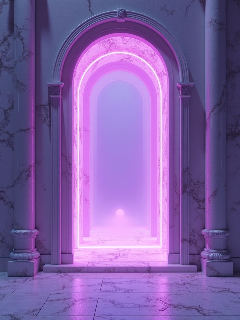 A ruined temple doorway in pale marble, its archway partially converted into a hovering violet wireframe portal, amethyst pulses moving through the columns, lavender haze on the floor, cinematic night lighting, hyper-realistic, 8k