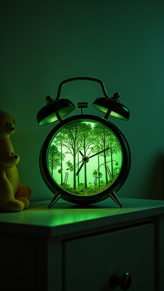 A retro bedside alarm clock glowing on a nightstand before dawn, its illuminated green digits revealing a miniature orchard built inside the number windows, tiny ladders leaning against mint-green trees, soft green fruit lanterns hanging between the branches, deep forest shadows across the bedroom wall, a familiar morning object turned into a precise impossible world, richly layered, hyper-detailed, realistic, sharp focus
