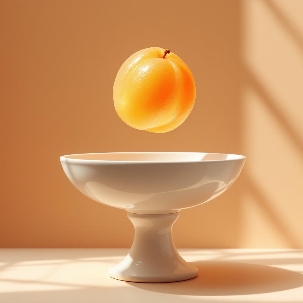 A still life of translucent apricot fruit hovering in perfect orbit above a white pedestal bowl, soft peach shadows, calm studio light, refined impossible realism