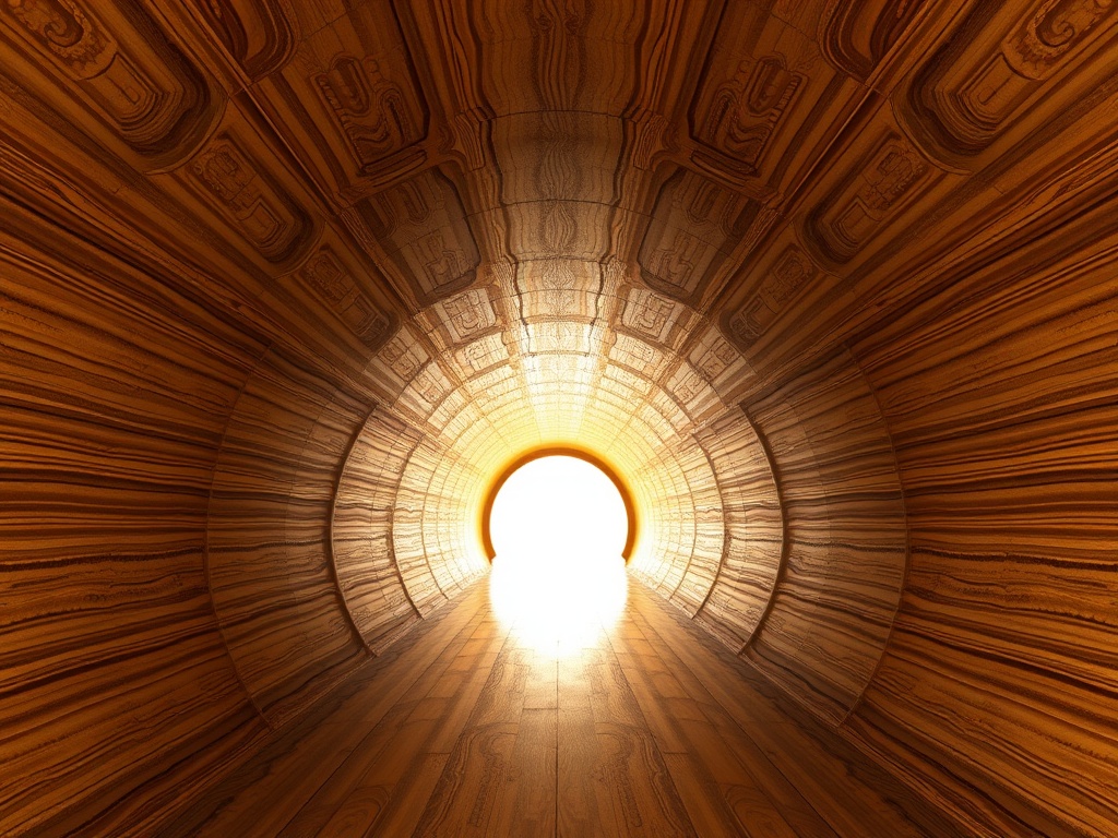 A long arched tunnel built entirely from layered polished wood, soft brown light at the far end, immersive symmetry, impossible craftsmanship