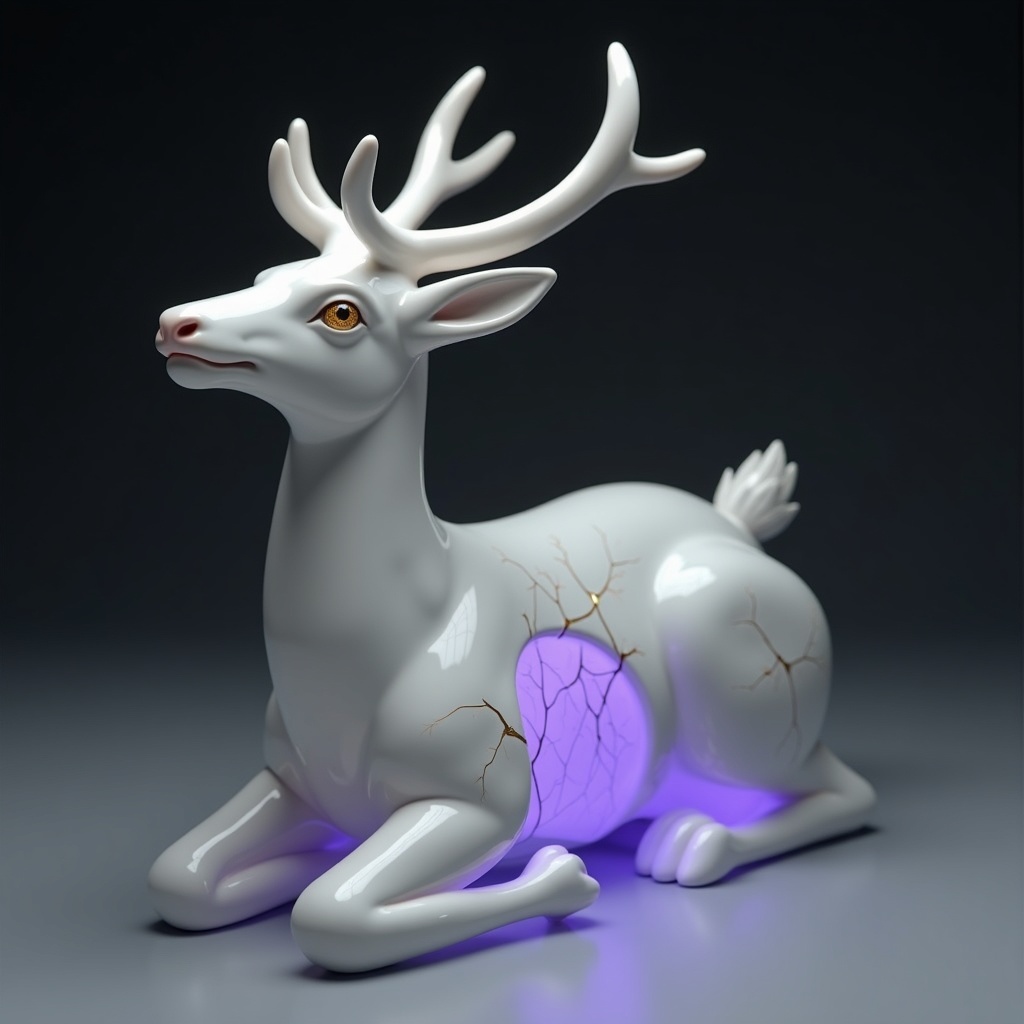 A graceful white ceramic deer with fine porcelain antlers, delicate cracks revealing a violet inner light and soft lavender haze within the chest, subtle gold detailing, deep plum shadows under the body, cinematic stillness