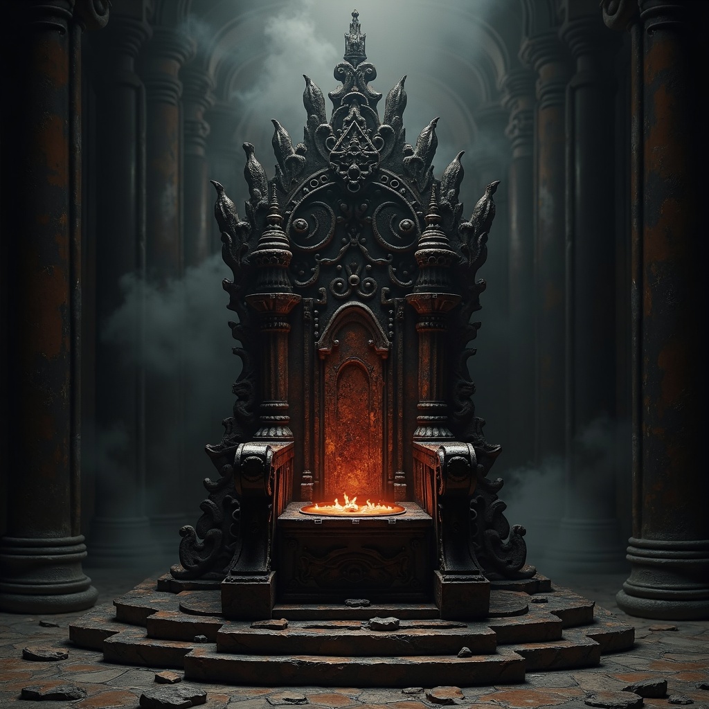 A dark imperial throne carved from scorched wood and brown marble, faint smoke rising from the seat, cathedral-scale chamber, infernal majesty