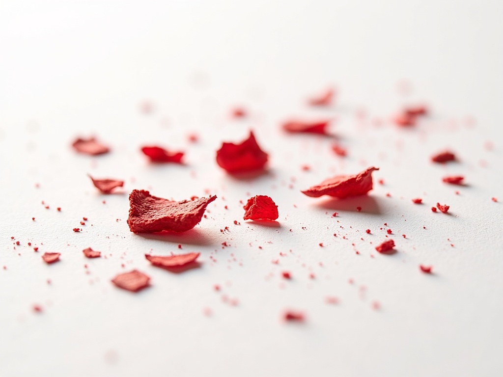 Minimal macro composition of torn crimson pigment fragments scattered across textured white paper, soft directional light, refined abstract editorial still life, high detail