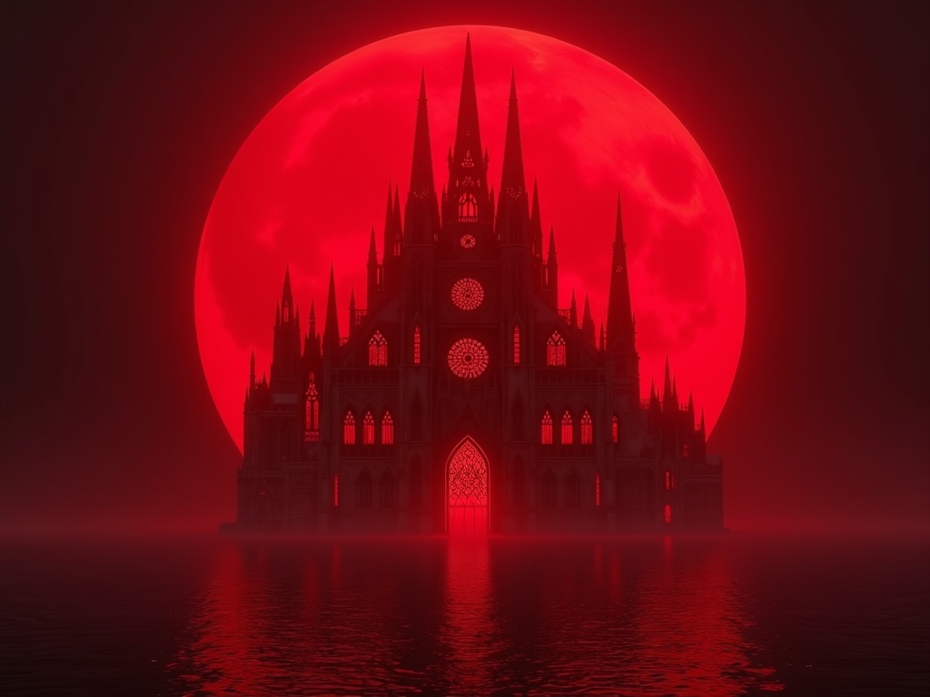 A colossal gothic cathedral carved entirely from translucent crimson crystal, floating inside a gigantic blood-red moon above a dark reflective sea, towering arches, luminous stained-glass interiors glowing from within, cinematic night atmosphere, surreal impossible scale, deep scarlet haze, premium fantasy realism, dominant monochromatic red palette, rich shadows, elegant symmetry, visually overwhelming, no competing colors, no text