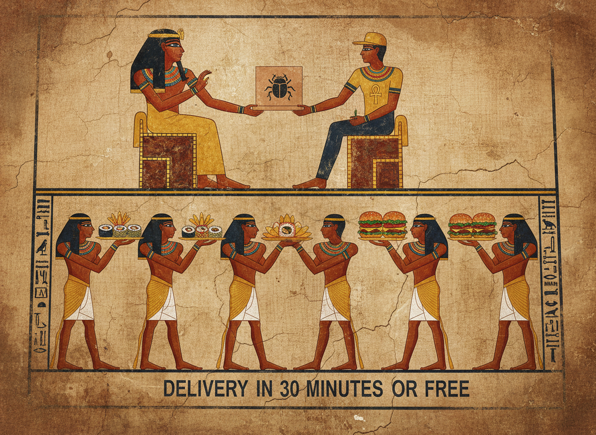 A fresco in the style of Ancient Egypt, a pharaoh receiving a pizza delivery box, servants carrying sushi and burgers on golden trays, hieroglyphs on the wall reading delivery in 30 minutes or free, profile figures in canonical poses, colors of ochre lapis lazuli and gold, composition arranged in horizontal rows, stylized flat figures with Egyptian eye makeup, papyrus texture, 8k