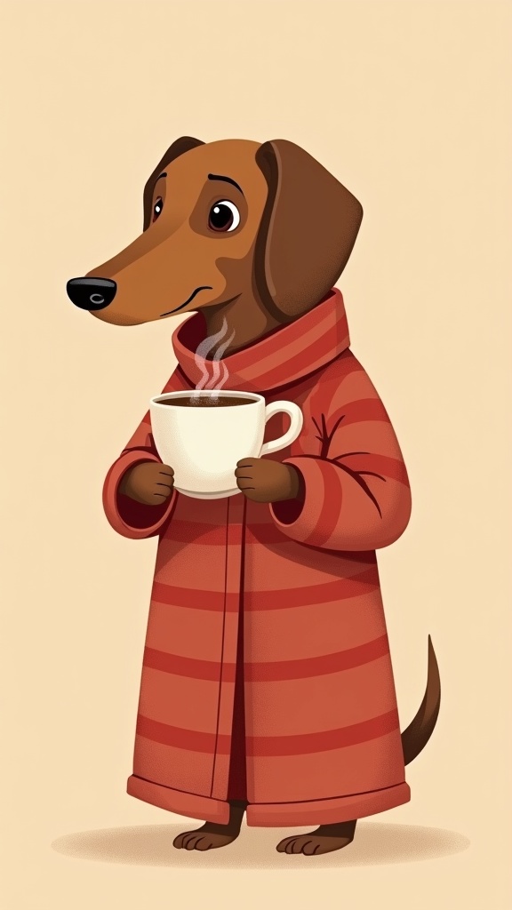 A tall elegant dachshund wearing a cozy red striped turtleneck robe, holding a white coffee mug with steam rising, warm beige background, minimalist digital illustration style, muted earthy browns and terracotta red palette, 8k