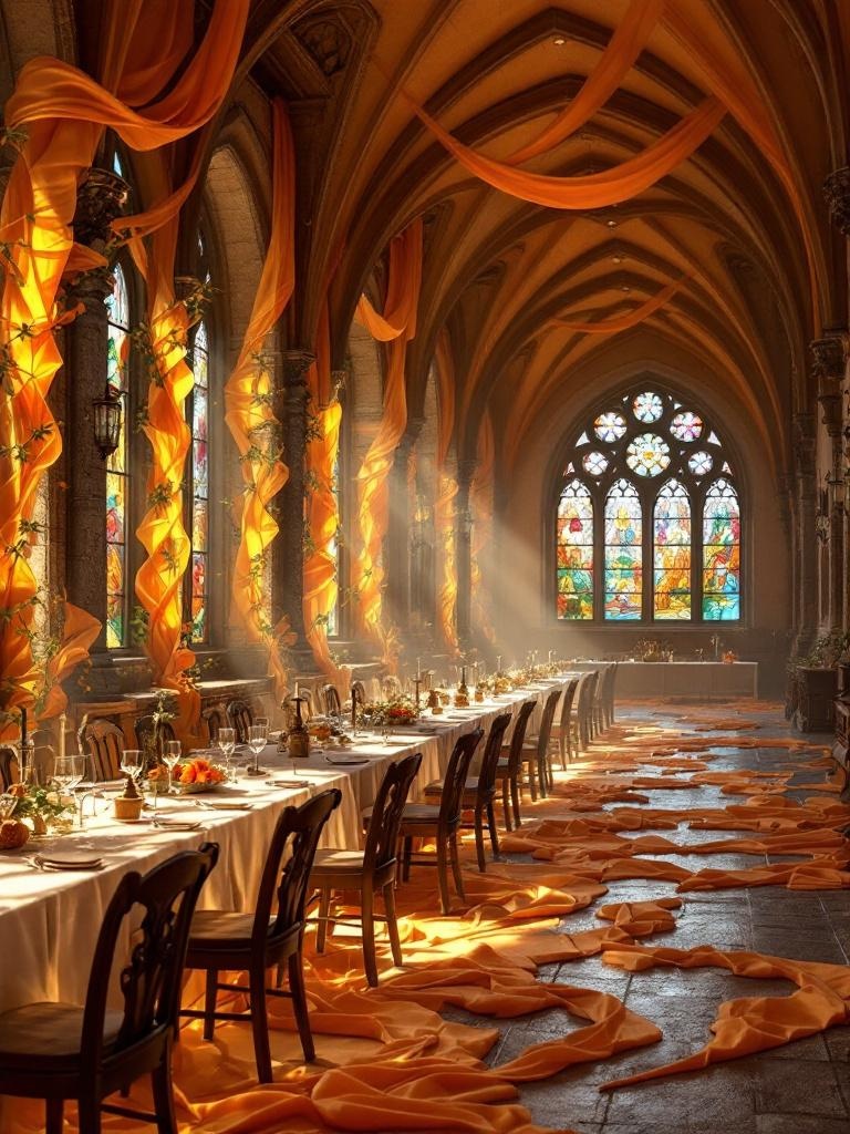 A monastic dining hall with long wooden tables, but the stained glass windows pour thick apricot light like liquid fabric across the floor, the orange folds pooling around carved chairs and climbing the walls, solemn atmosphere, realistic, richly detailed, 8k