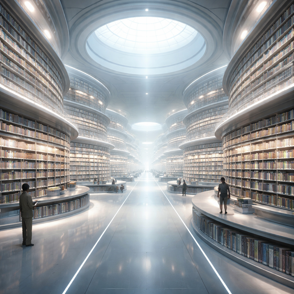 Futuristic library with endless shelves and soft diffused lighting