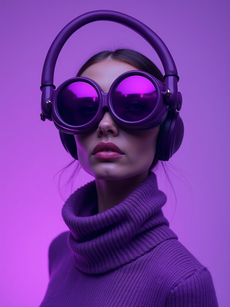 Fashion portrait, centered bust shot of a futuristic model wearing oversized glossy goggles and a sculptural looped headpiece, dominant amethyst-purple palette, thick wrapped knit collar in rich amethyst tones, smooth studio background with a subtle purple gradient, editorial beauty styling, surreal fashion campaign, crisp symmetry, soft controlled light, premium detail.