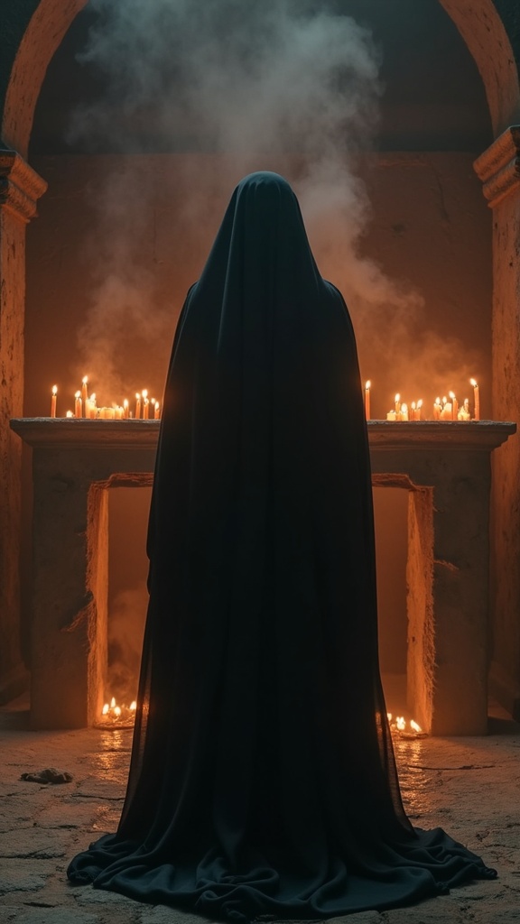 Alone woman in a long dark veil standing before a gothic altar of burnt stone, warm brown candle smoke circling around her, mystical editorial hero shot