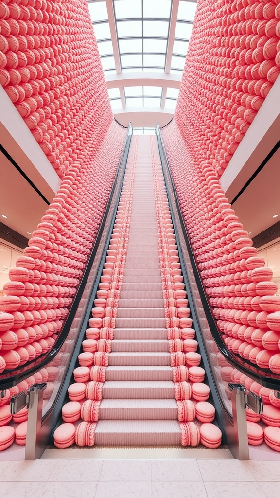 A monumental escalator made from endless rows of blush macarons, soft pink symmetry, clean mall architecture, iconic hero frame