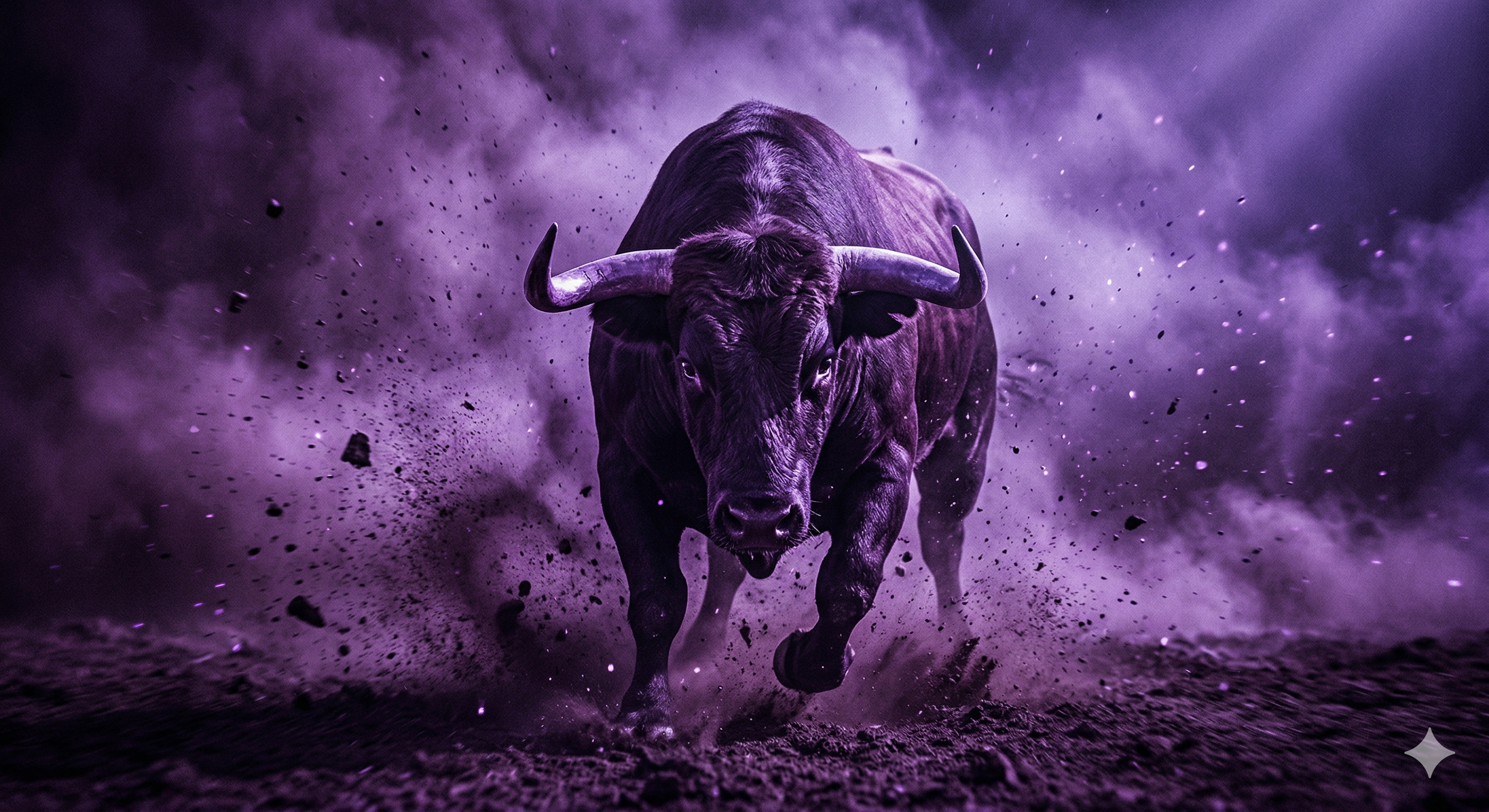 Ultra-dramatic cinematic image of a powerful bull charging directly toward the camera through a storm of dust, intense motion, low-angle composition. The entire scene is meticulously rebuilt around a monochromatic purple family palette: soft pastel lilac, vibrant amethyst, rich royal violet, and shadowy deep velvety plum. The background is dominated by a shadowy deep velvety plum. The dense flying dust is powerfully illuminated in tones of vibrant amethyst and rich royal violet, with subtle pastel lilac particles glowing intensely in the light. The bull is kept dark and powerful with deep purple reflective highlights across its body. Extreme contrast, prestige cinematic grading, premium texture, aggressive energy, high detail. No warm brown or orange contamination. No text.
