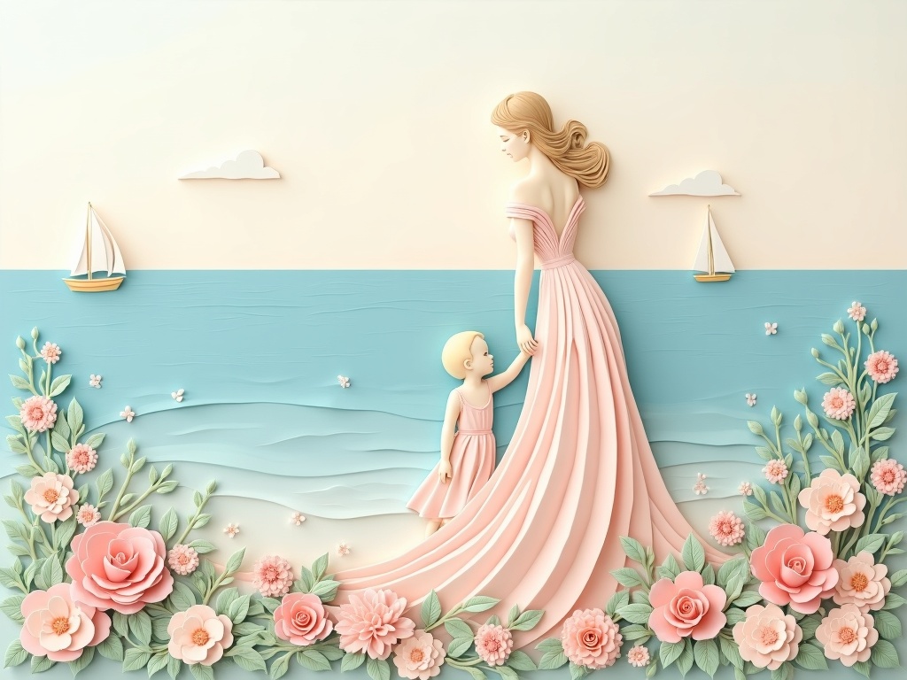 Delicate paper-art composition of a woman and child by the sea, the woman's gown flowing into layered flowers and botanical forms, small sailboats in the distance, pastel handcrafted relief, elegant storybook mood