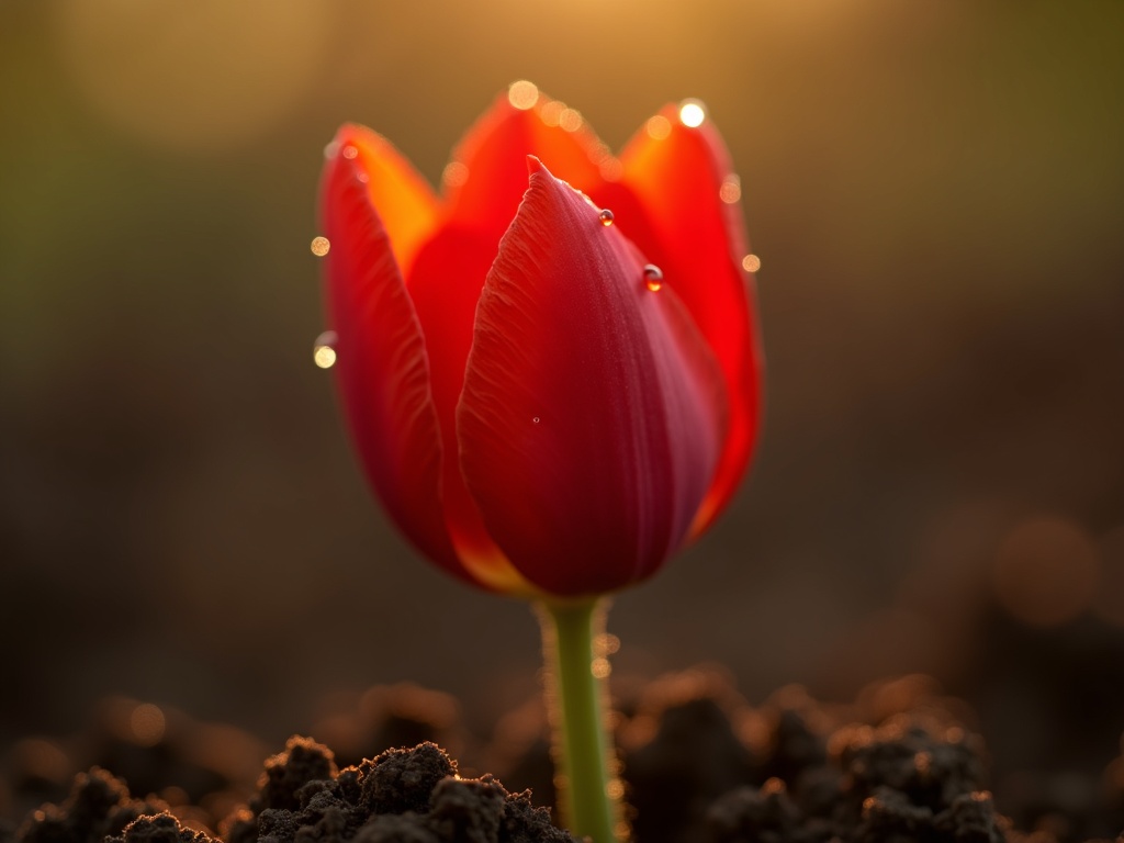 Extreme macro close-up of a single red tulip bud just emerging from dark rich soil, the tight crimson petals still closed and pointing upward, tiny crystal-clear water droplets clinging to the velvety surface catching warm light like jewels, the stem pale green and slightly fuzzy with fine hairs visible, a few crumbs of dark wet earth on the petals, the background a soft warm blur of browns and greens, the depth of field razor-thin with only the tip of the bud in sharp focus, morning golden light from behind creating a warm rim glow around the bud edges, nature macro photography, 8k