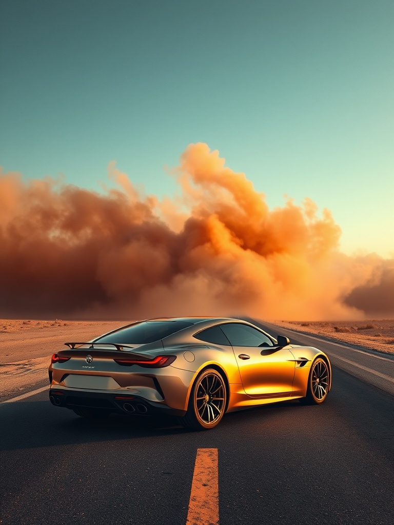 A sleek coupe parked on an empty desert highway as a warm brown dust storm rolls in behind it, glossy bodywork, dramatic sky, premium surreal realism