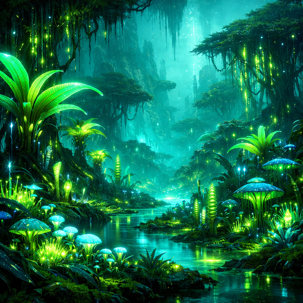 Futuristic alien jungle, glowing green plants, turquoise mist in the air, bioluminescent vegetation, high saturation, sci-fi environment, concept art, ultra detailed