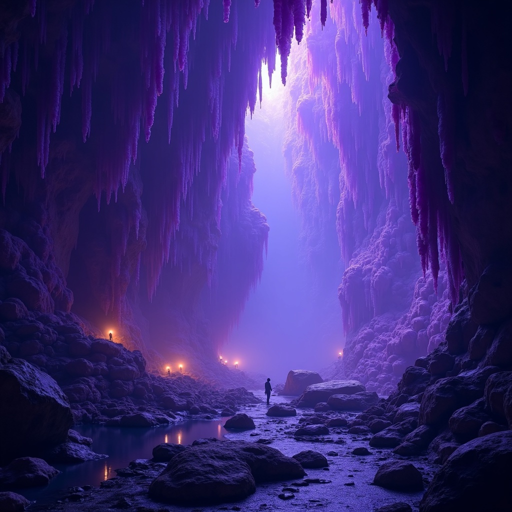 A vast underground cavern transformed into a natural cathedral by enormous amethyst crystal formations growing from floor to ceiling, a narrow stone path winding between the clusters, an underground river reflecting the violet glow, tiny explorers with lanterns for scale, stalactites dripping with mineral water, atmospheric fog, epic landscape photography