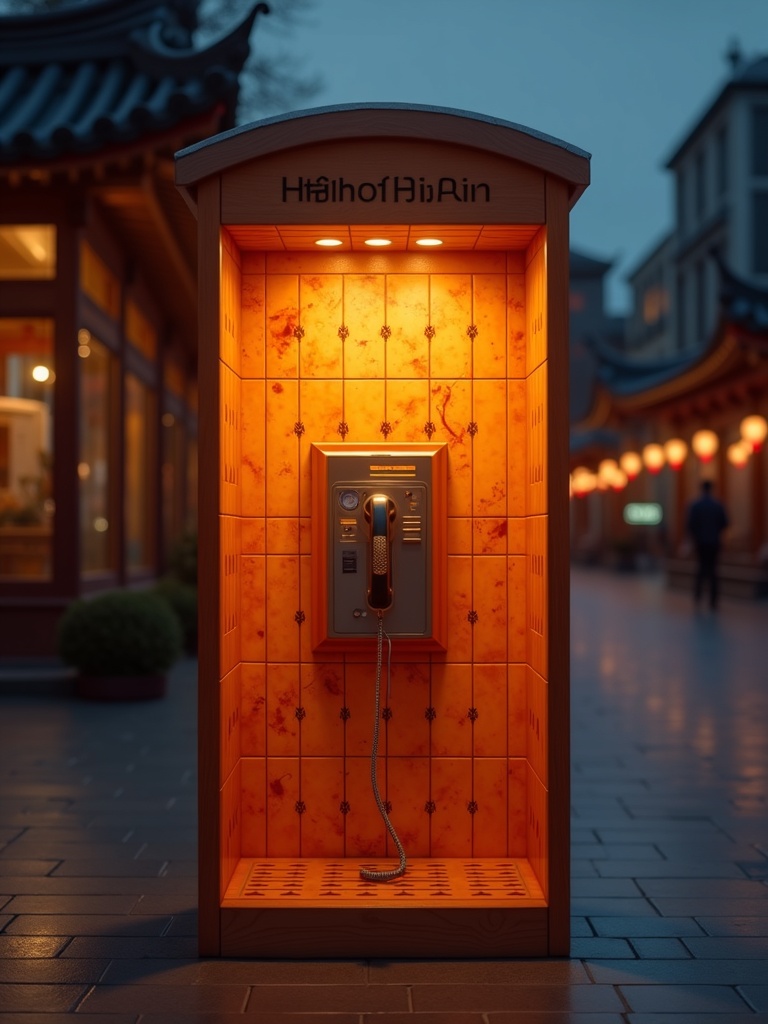 A forgotten public phone booth transformed into a sacred relic, its receiver replaced by a loop of glowing mandarin glass, the booth interior lined with apricot votive tiles and burnt orange ash patterns, standing alone in a modern plaza at dusk, reverent atmosphere, ultra detailed, 8k