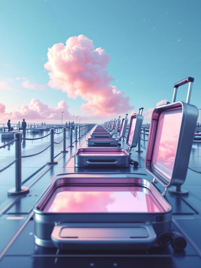 A modern airport security line imagined in the spirit of Rene Magritte, suitcases open to reveal pastel light pink skies instead of belongings, classic pink rose clouds hovering above metal trays, calm visual paradox