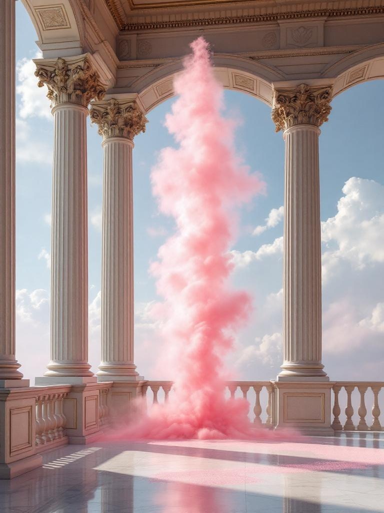 A neoclassical balcony where a tall vertical plume of pink powder rises silently from the floor to the sky, soft morning light, monumental fine-art realism