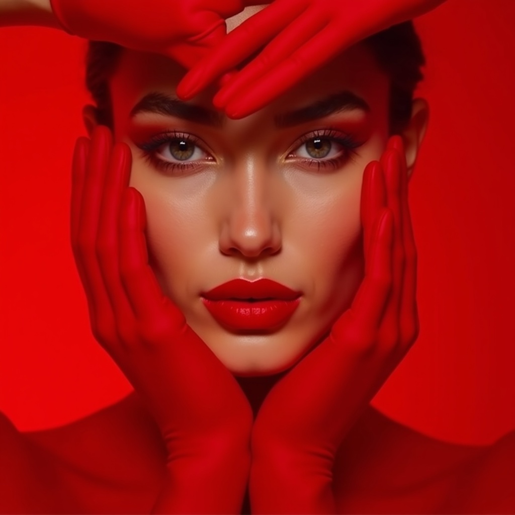 Ultra-clean beauty close-up of a model with luminous skin, glossy lips, and dramatic red gloves framing the face, tight centered composition, soft cinematic lighting, premium cosmetics campaign aesthetic, dominant red palette in the gloves, background glow, and makeup accents, natural skin kept realistic, smooth gradients, refined luxury finish, high detail in eyes and skin texture, no extra accessories, no strong secondary colors, elegant and expensive-looking